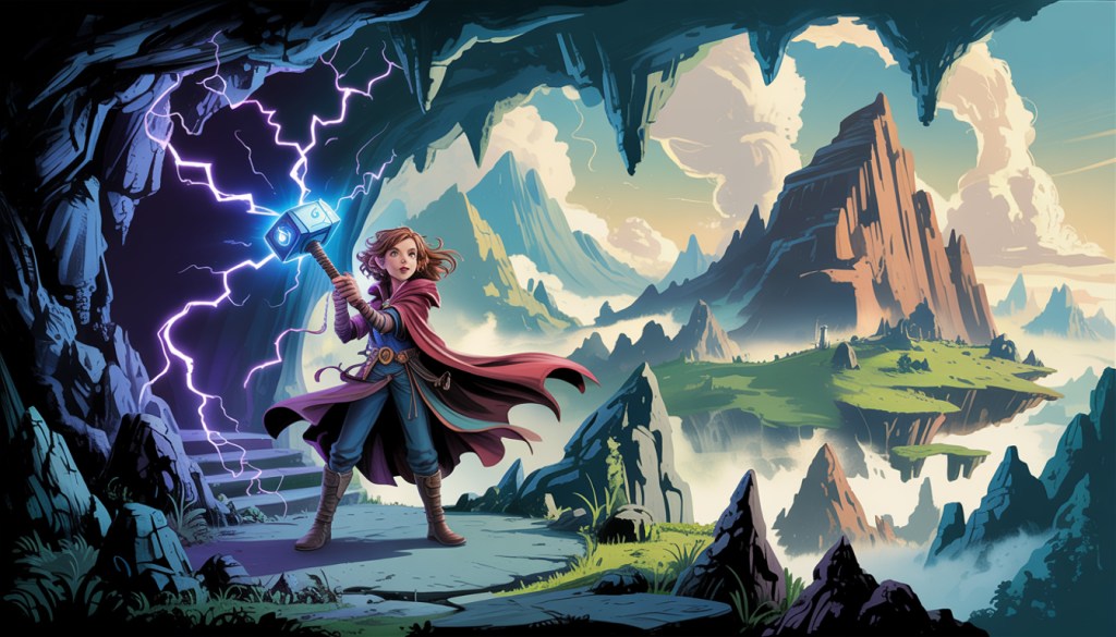 Once upon a time, in a land filled with mysterious caves and towering mountains, there lived a young magician named Elara. Elara was unlike any other magician in the village—she wielded a legendary hammer known as Mjolnir, the Hammer of Thor. This was no ordinary tool; it pulsed with the power of lightning, and only those pure of heart could use it.