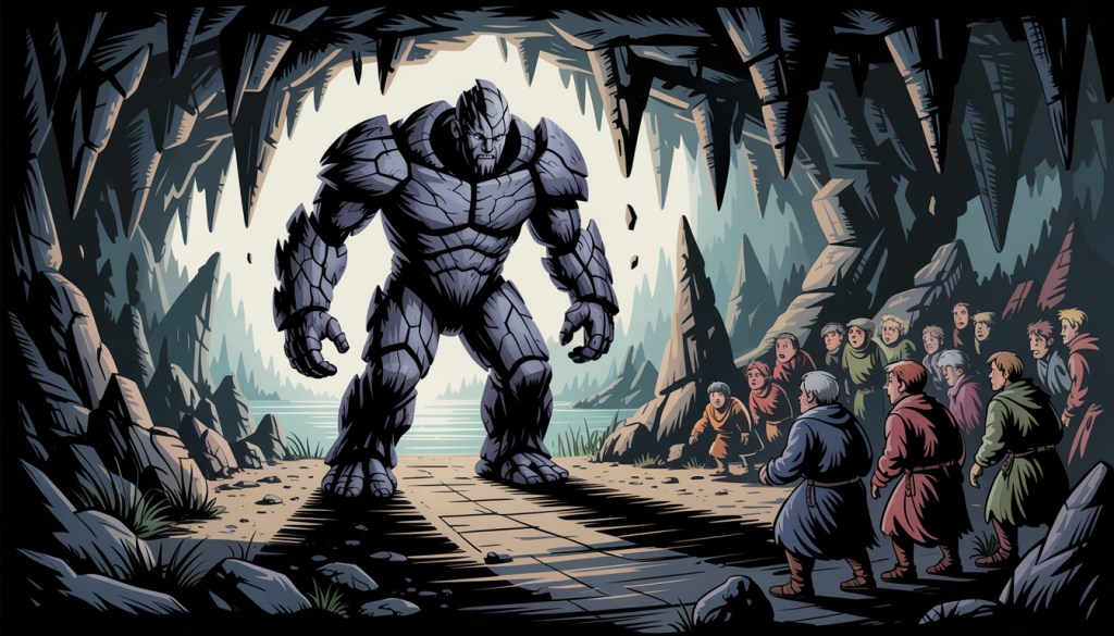 One day, a terrible rumble shook the earth. A monstrous creature, the Golem, made of solid rock, awoke deep within the dungeon cave. The villagers were terrified, for the Golem blocked the passages to the river, and without water, their crops would wither.