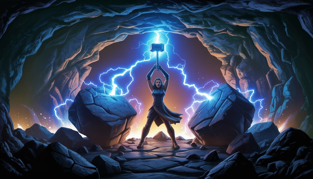 Elara bravely volunteered to venture into the cave. With Mjolnir glowing in her hands, she entered the dark, winding tunnels. As she walked, huge boulders blocked her path. She raised the hammer high and called out, “Lightning, strike!” With a crack and a flash, bolts of lightning leapt from the hammer, shattering the obstacles and lighting up the cave in brilliant blue.