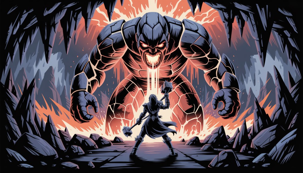 Deeper inside, Elara finally faced the Golem. The creature’s rocky body towered over her, its eyes glowing like molten lava. The Golem roared, shaking the cave walls. Elara gripped her hammer, focusing all her magic.