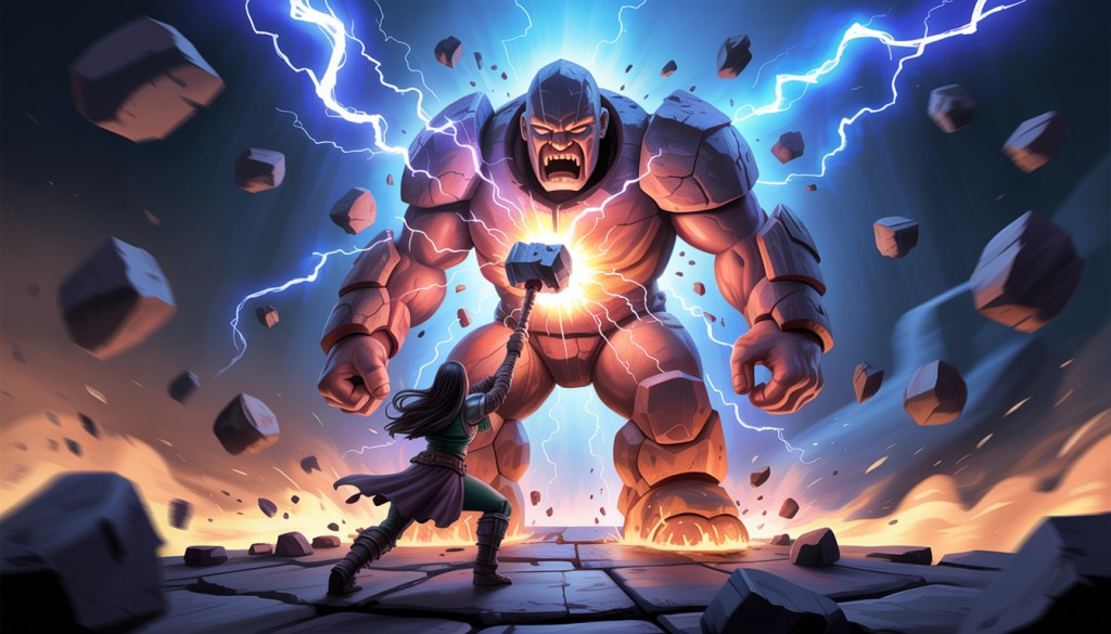 With a mighty swing, she struck the Golem’s chest. The hammer unleashed a thunderous bolt of lightning, breaking the stone and sending sparks flying. The Golem staggered, pieces of rock crumbling away. She struck again, and again, until the Golem’s body broke apart, revealing a glowing crystal core.
