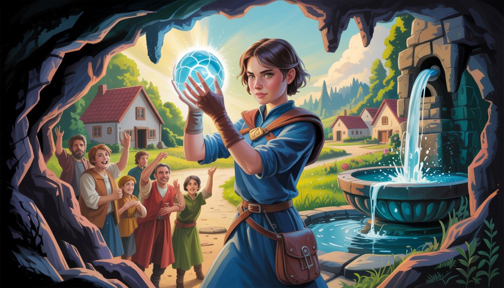 Elara carefully lifted the core and placed it in her pouch. As she left the cave, the villagers cheered, and water flowed freely once more. Elara had saved her village, proving that courage and magic, when combined, could overcome even the toughest obstacles.