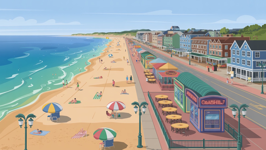 Hampton Beach in New Hampshire is a lively seaside destination along scenic Route 1A, known for its wide sandy beach, bustling arcades, casual and seafood-focused restaurants, classic inns, and family-friendly boardwalk atmosphere. Visitors can enjoy swimming, sunbathing, playing games in the arcades, browsing souvenir shops, and dining at local eateries, all within walking distance of the oceanfront. The area is especially popular in the summer for concerts, festivals, and its vibrant nightlife scene.