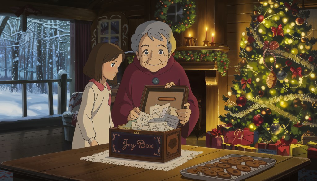 Clara lived with her grandmother, Nana Rose, in a cozy cottage at the edge of the woods. Each year, they decorated their home with ornaments passed down through generations, and Nana Rose baked her famous gingerbread cookies. Nana Rose smiled mysteriously. “That, dear, is the Joy Box. Every Christmas, someone in our family adds a special note inside.”