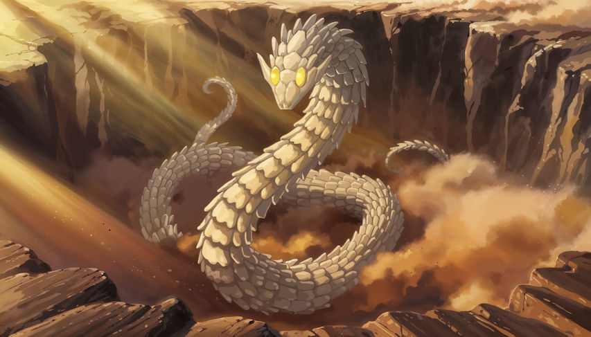 From the chasm rises a creature of bone and sand: the Serpent Khan’Rih. Its body coils, forming spirals upon spirals, scales of sun-baked ivory. Its eyes—blazing gem-like opals.