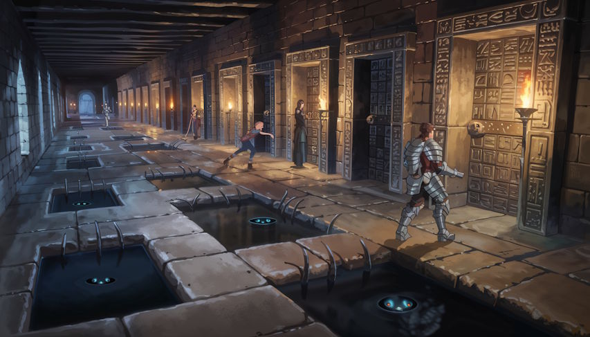 Inside, corridors stretch and diverge. Doors etched with hieroglyphs warn of illusions. Pools of still black water glinting with eyes. Thorne’s armor echoes—every passage seems alive. Traps snap shut, spikes descending. Only Elara’s nimble agility and Rheya’s deciphering guide them through.