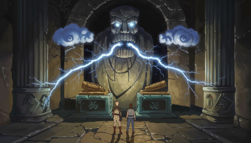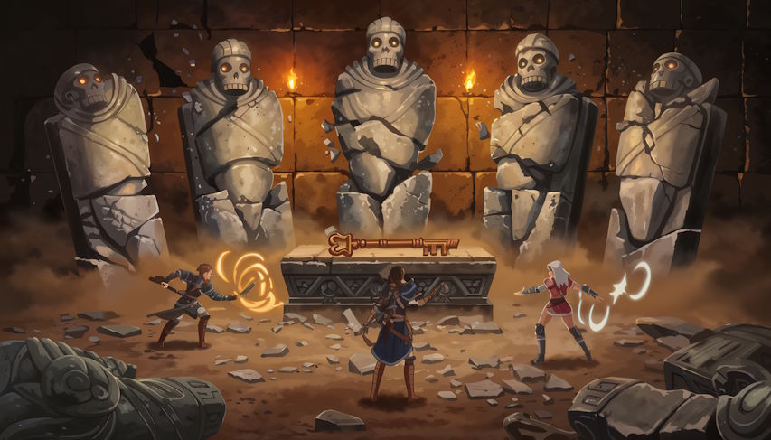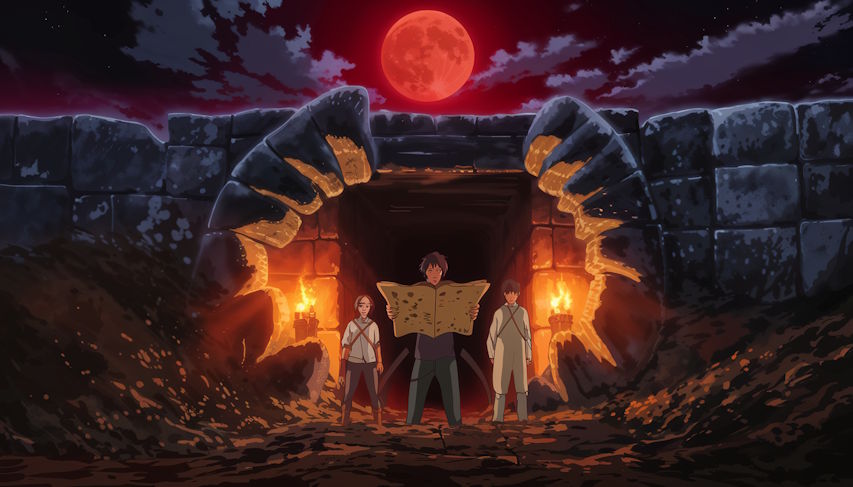 Under the red moon, the trio uncovers the sealed entrance. Massive stone jaws open with a rumble as Rheya recites the incantation inscribed on her map. An echoing chamber yawns, ancient torches flickering alight by unseen magic.