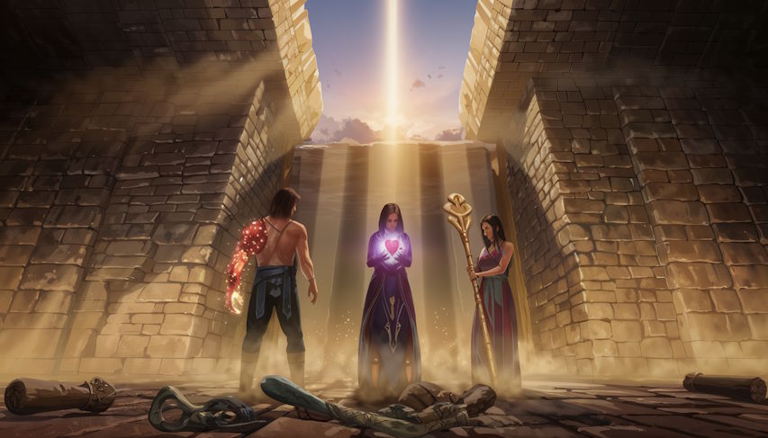 Their sacrifices cause stone mechanisms to grind. The Staff ascends higher; behind it, the Heart of Seshkura uncovered, pulsing like a heartbeat. But as they reach for both, the sands split.