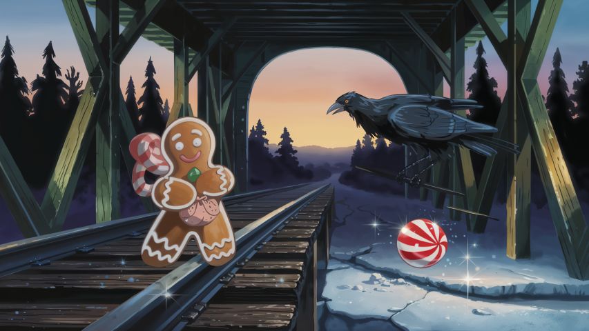 Crispin clutched his crumbed arm. “Better ginger than crow food,” he snapped. He reached into the pouch fashioned from licorice laces around his waist, withdrew a peppermint marble given by the toys, and hurled it. The peppermint struck the rail, spinning madly and catching moonlight. The crow’s predator instinct twitched—it dove for the flicker. Crispin zipped between its wings, scrambling across the bridge.
