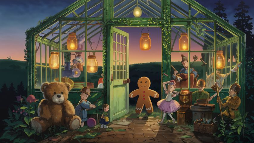 Down the hill stood an abandoned greenhouse, a secret gathering place for forgotten playthings. Lanterns fashioned from mason jars glowed amber inside. Crispin sniffed nostalgia and curiosity.