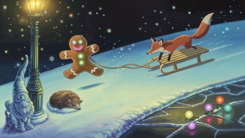 He somersaulted over a snowbank and landed on a sled left by neighborhood children. Tiny frosting fingers grabbed the rope; with a running start, he hopped aboard. Gravity pulled the sled downhill past maple trees still strung with colored bulbs. The fox gave chase, paws skidding.